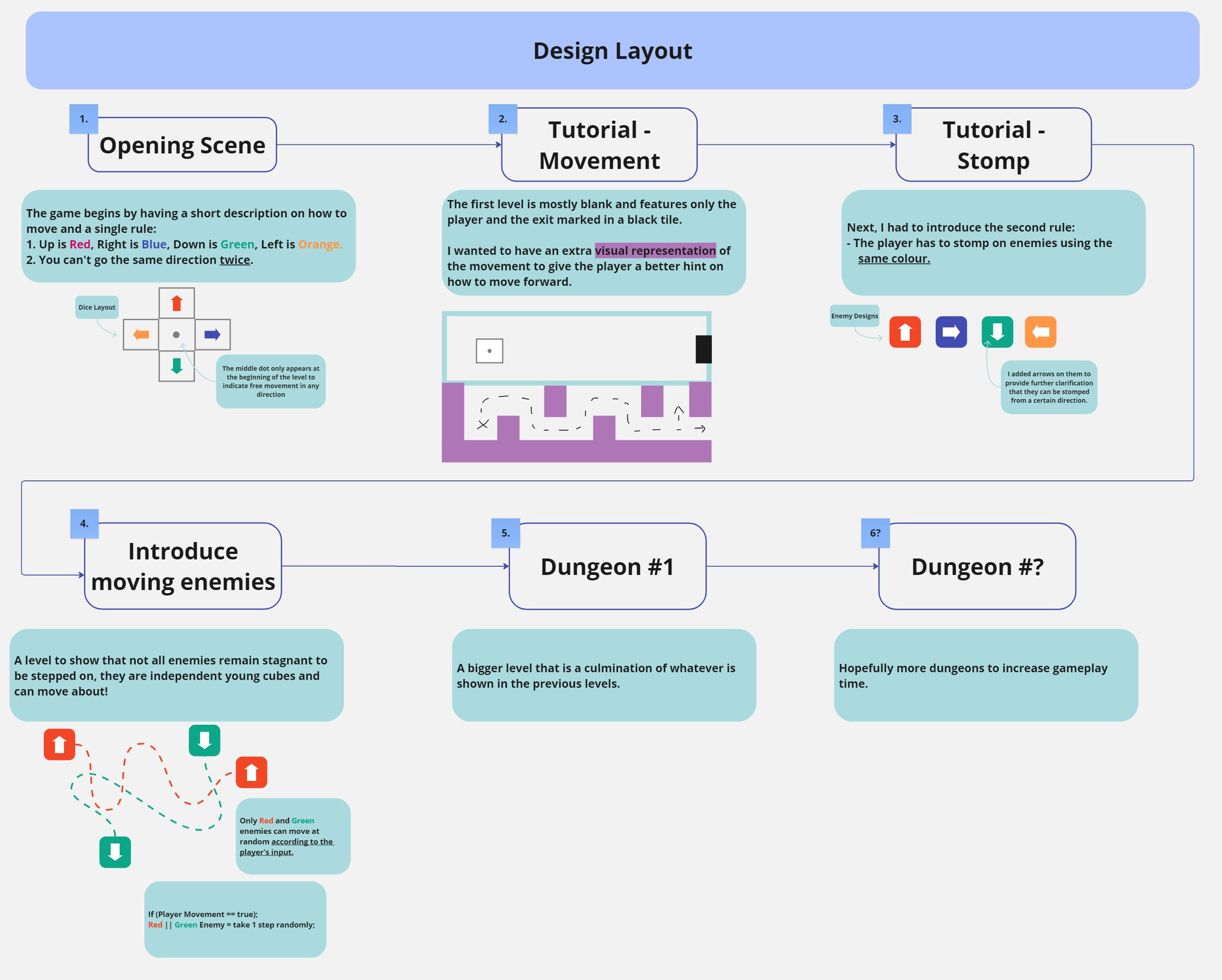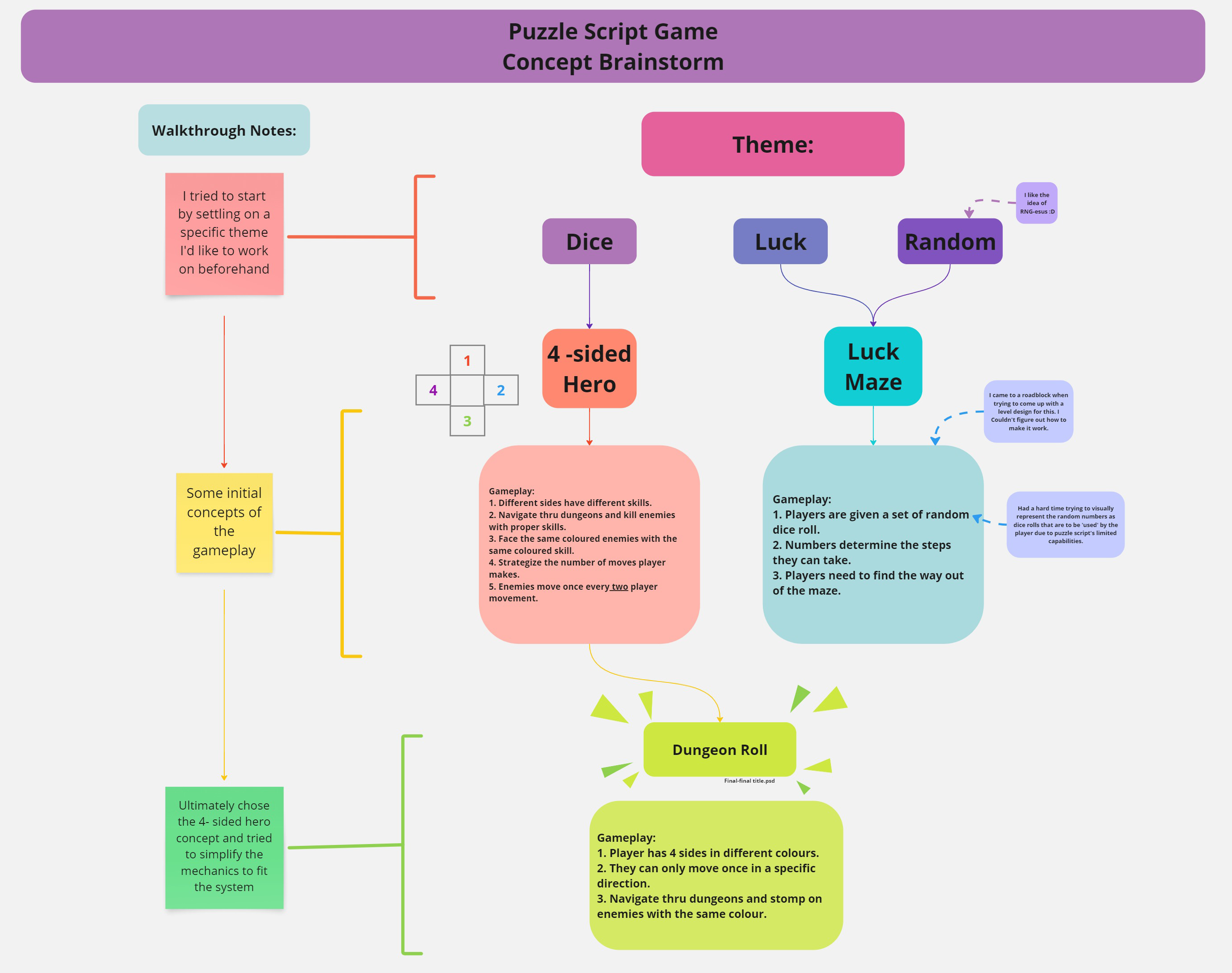 I started by picking themes I'm interested in and try my best to come up with potential game ideas and then pick a concept that sounds fun and within a feasible scope. Then I would design the layout of the puzzles for each level, making sure to introduce the mechanics of the game at each stage and then combining them all at the last stage and letting players figure it out themselves.